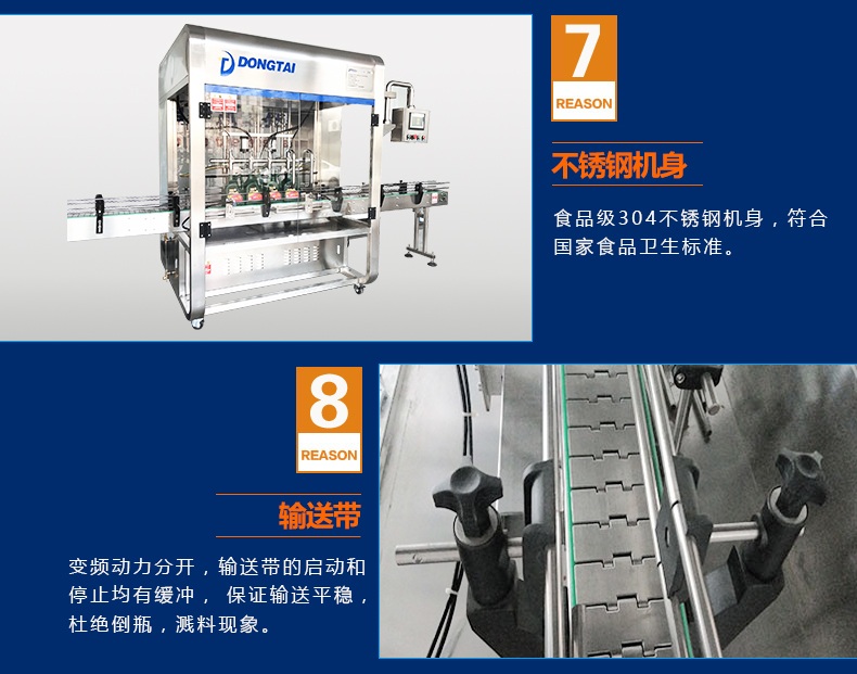 8.變頻動(dòng)力分開,輸送帶的啟動(dòng)和停止均有緩沖,保證輸送平穩(wěn),杜絕倒瓶,濺料現(xiàn)象。
