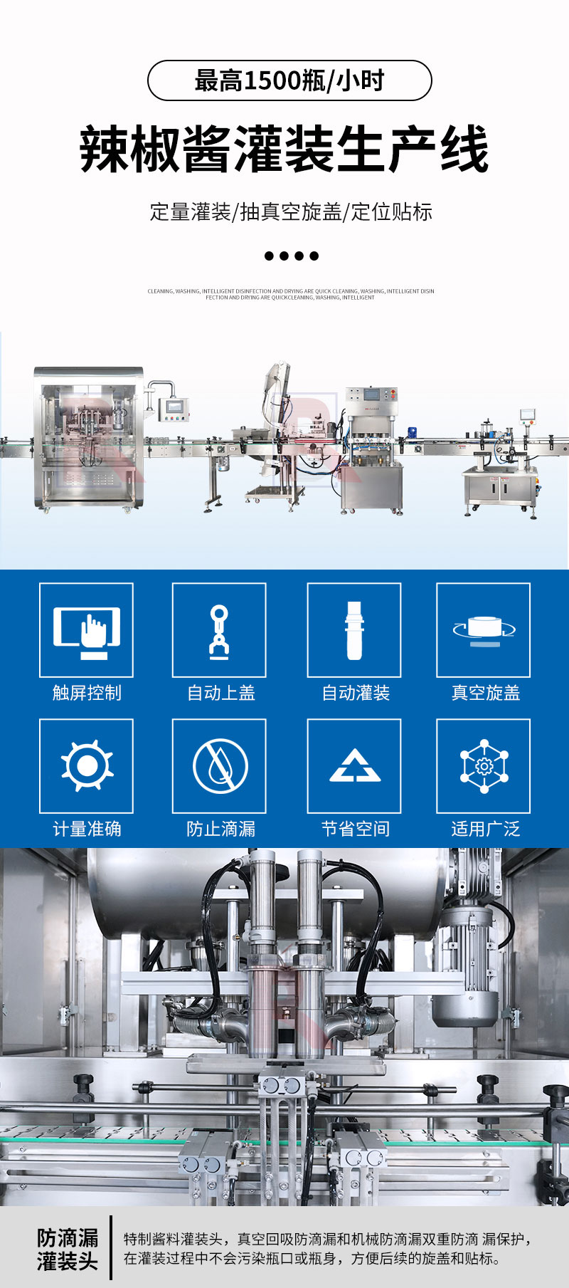 雙頭辣椒醬灌裝生產(chǎn)線適用于調(diào)味品中帶顆粒并且濃度較大的香菇醬、豆瓣醬、花生醬、芝麻醬、果醬、牛油火鍋底料等醬類的灌裝。