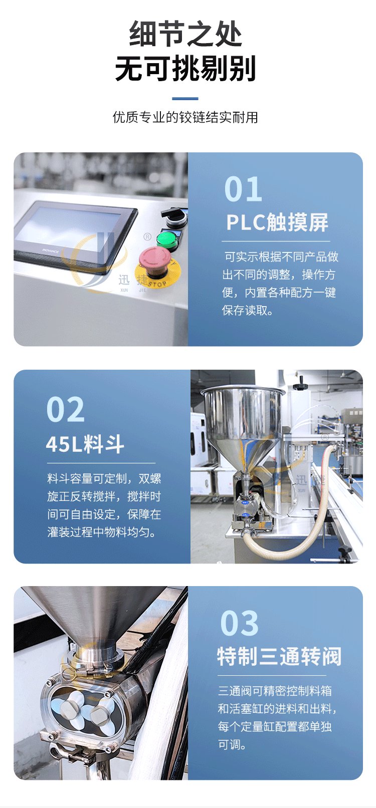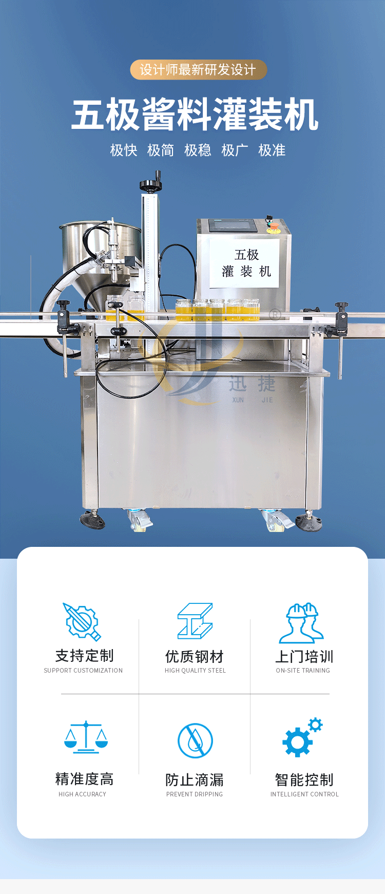 五極灌裝機(jī):極快-單頭2200瓶/時(shí) 極簡(jiǎn)-操作簡(jiǎn)單 極廣-啥啥都能灌 極穩(wěn)-24小時(shí)不停機(jī) 極準(zhǔn)-200g誤差小于1g。它可以和真空旋蓋機(jī)搭配使用。