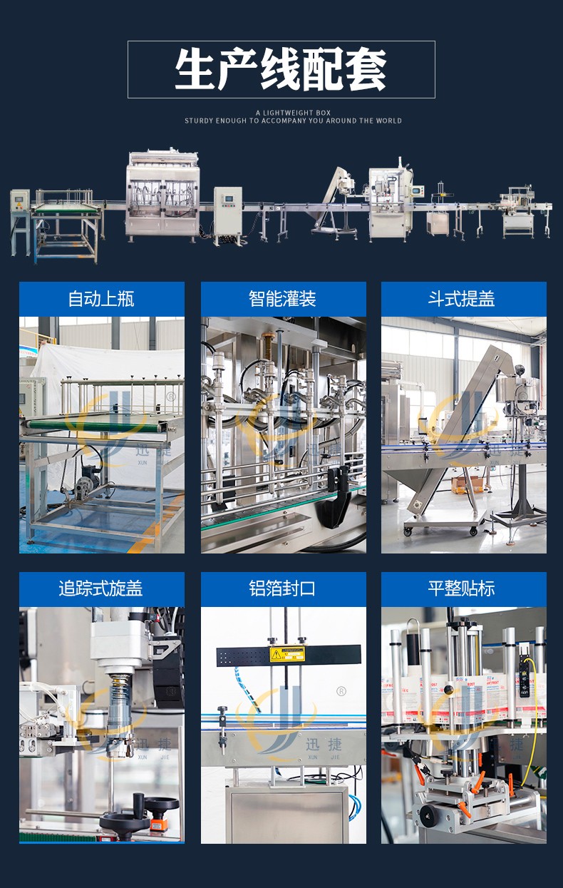 全自動液體灌裝機迅捷_01.jpg全自動液體灌裝機用于灌裝飲料、果汁,牛奶,酒精,消毒液,口服液,洗衣液等液體,廣泛應用于食品,化工,醫療等行業,灌裝精密,功能強,實用性高的灌裝機械。