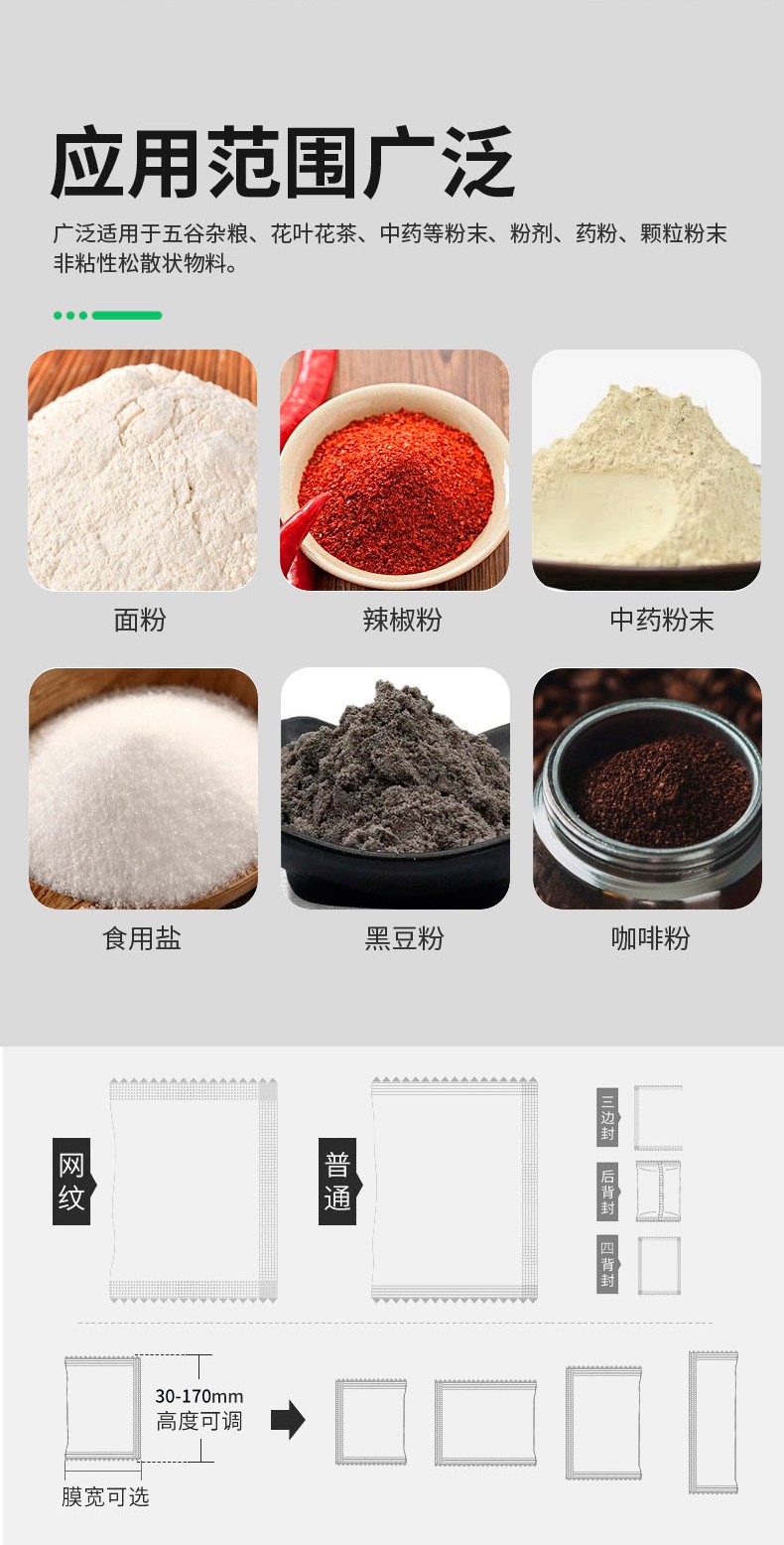 粉劑包裝機比較適用于豆奶粉、辣椒粉、奶粉、咖啡面粉、面粉等物品的計量包裝。與此同時還可以包裝淀粉、奶粉、食用鹽、中藥粉末、調味品、黑豆粉、預混料、飼料、酶制劑等。粉劑包裝機包裝材料:BOPP薄膜、紙/聚乙烯、玻璃紙/聚乙烯、聚酯/鍍鋁/聚乙烯、聚酯/聚乙烯、茶葉濾紙等可熱封復合包裝材料。
